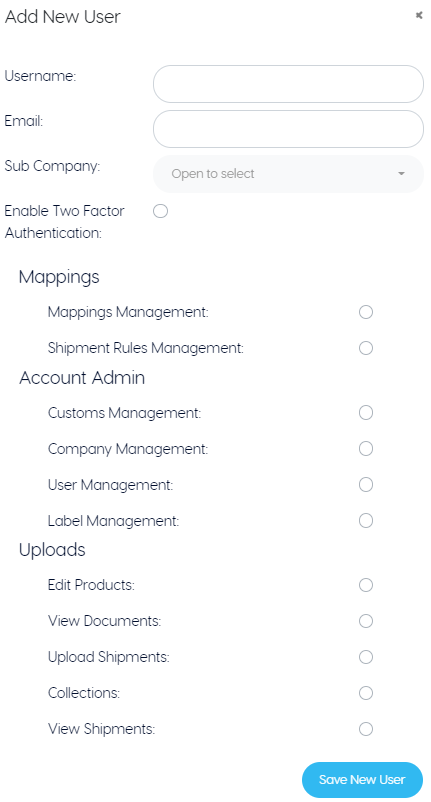 To create new sub-users, simply click “Add New User” within the User Management tab in settings. Here, you’ll be prompted for mandatory information. Once submitted, an email will be sent to confirm their username and login URL.