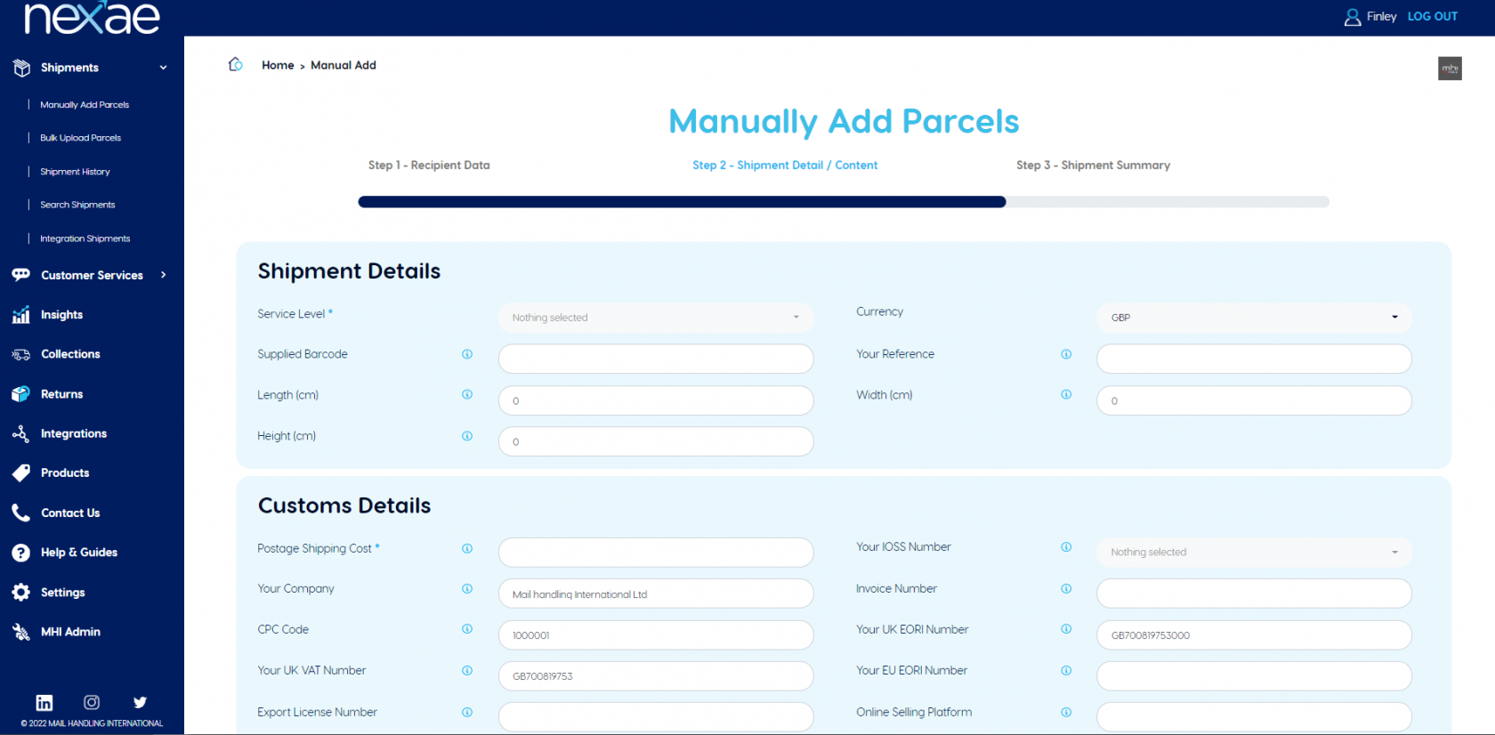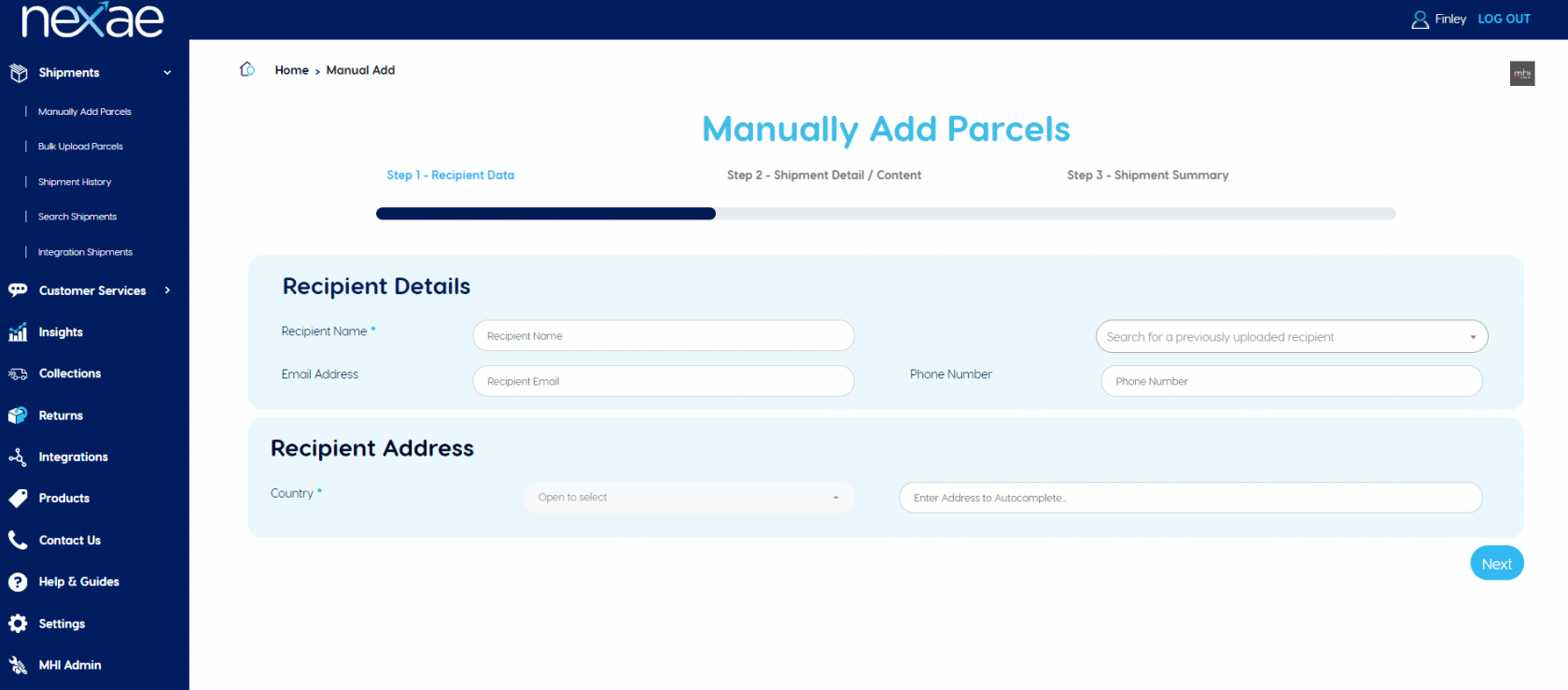 To get started, click “Shipments” on the left-hand menu to reveal dropdown options & click “Manually Add Parcels”.